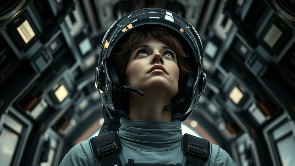 Cinematic 8k wallpaper of Ellen Ripley from Alien movie; an astronaut with helmet on, visor closed, gazing upwards in an action pose. She stands amidst the intricate interiors of the Nostromo space shuttle, embodying the essence of sci-fi. Bathed in ultra-detailed ray tracing and highest detail quality, the scene flaunts chiaroscuro and an ultra-realistic, epic feel akin to promotional art. The overcast reflection mapping coupled with hyperphotorealistic details emphasizes rim lighting and stoic cinematic drama. Captured with a movie quality touch, reminiscent of being shot on a Canon 5D, the octane render delivers an 8k, ultra-realistic visual marvel subtly infused with creative nuances.