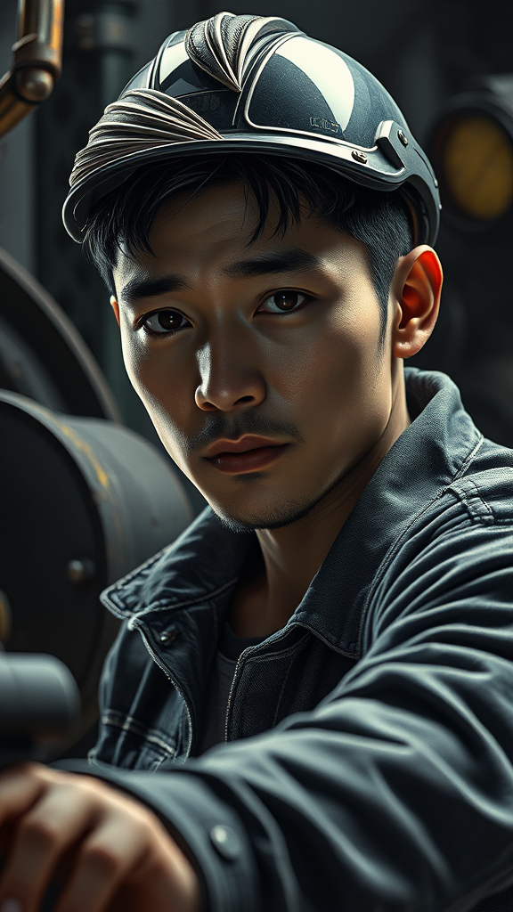 A captivating artwork featuring a man in a dynamic occupational setting, blending soft, lustrous elements with the ruggedness of an industrial, mechanical world. In a fantastic, yet realistic location, the worker is portrayed in a challenging environment. The scene is rendered in 8K unity, capturing the full body in an action shot with impressive detail—skin pores, intricate iris, and a compelling expression. The lighting is dramatically dark with heavy shadows, highlighting a detailed and expressive face. This digital painting, enhanced by octane render, carries the essence of artstation concept art with influences from Artgerm, WLOP, and Ilya Kuvshinov. The illustration is a harmonious blend of smooth textures and sharp focus, depicting an Asian figure in nuanced black and white tones, enhanced with a touch of 3D realism. The subject's attire in denim adds to the narrative, delivering a unique artistic experience.