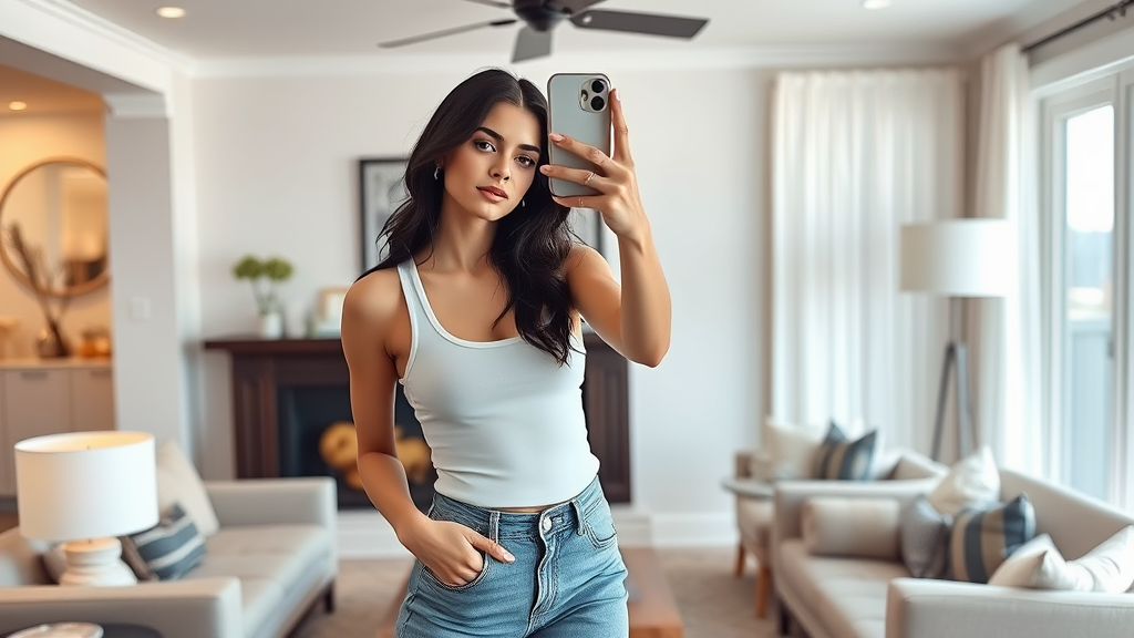 Kendall "Koh" Jenner posing in a stylish white tank top and classic denim jeans, capturing a selfie in the cozy ambiance of a chic living room, the scene exuding a sense of effortless elegance and modern simplicity.