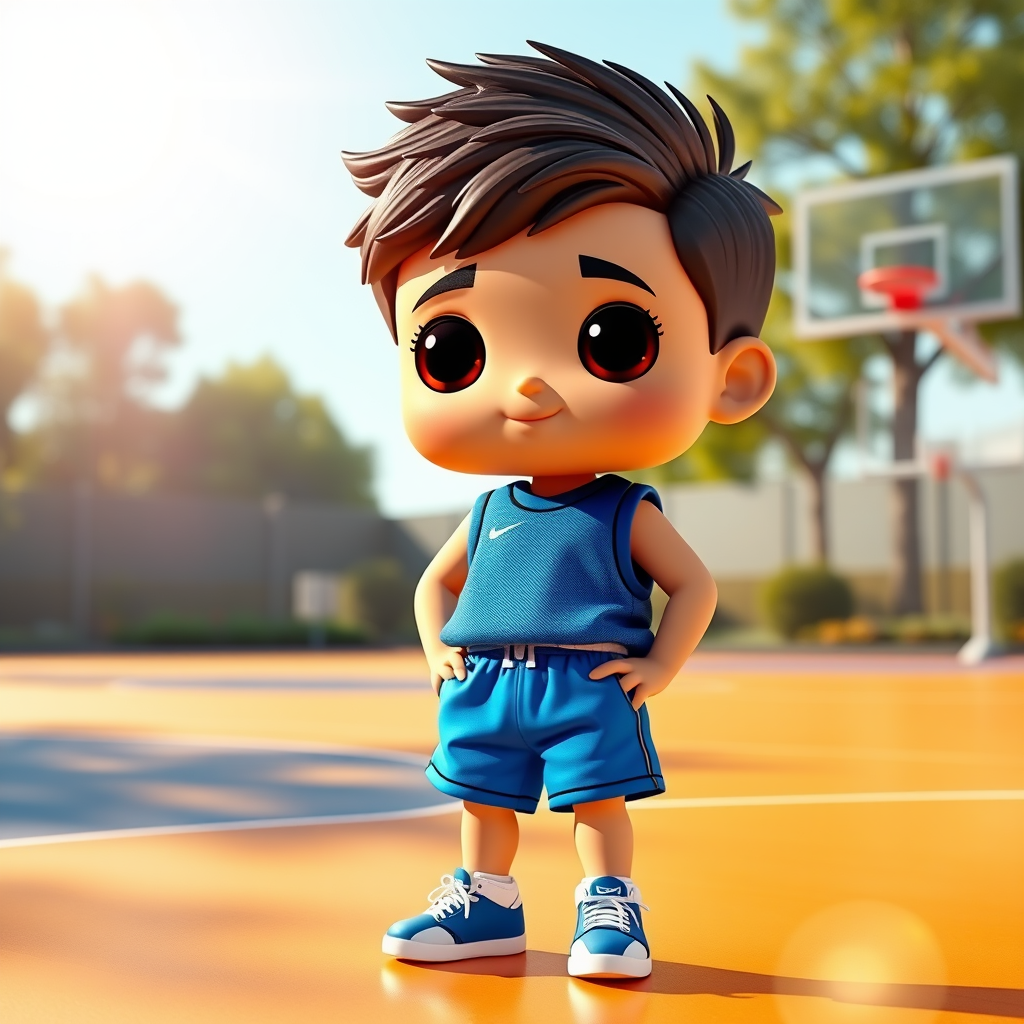 A charmingly adorable sports boy with big, expressive eyes wears a sleek basketball vest and vibrant blue shorts, standing on a pristine, sunlit basketball court. His entire presence radiates excitement and dreaminess, capturing the essence of a Pop Mart collectible. Rendered in high detail and hyper quality, the scene exudes bright, lively colors reminiscent of a Disney animation, with a playful sparkle that enhances his toy-like appearance. This 3D-rendered original character glows with a fine luster, showcasing the meticulous attention to detail and top-tier quality in ultra-high-definition 8k resolution. Bathed in front lighting, the face shot highlights the boy's enchanting features, making him irresistibly captivating, like the perfect addition to a mockup blind box collection.