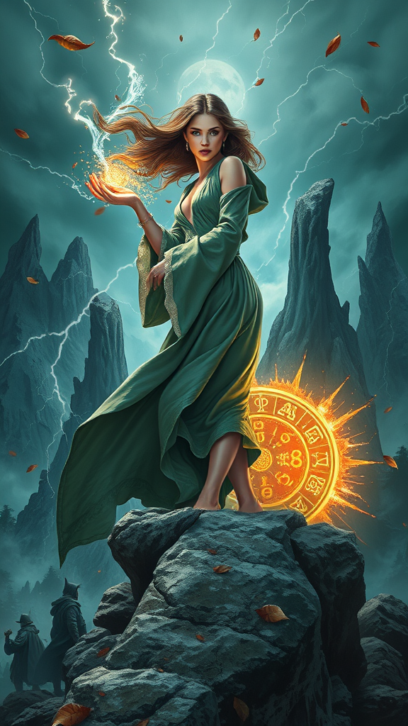 Art inspired by Robert Maguire, featuring a stunning pinup model with radiant skin and gentle lighting. She stands atop a windy mountain clad in a flowing wizard robe, amidst a fierce storm. The scene is captured in sharp focus as she conjures swirling water and crackling electricity, with sparks dancing around her. Majestic pillars of rock rise dramatically from the earth, and gusts of wind scatter leaves into the air. A glowing magical circle adorned with potent runes illuminates the area. Shadowy figures lurk in the background, poised against a dark forest backdrop. Retaining the essence of fantasy, the composition avoids anatomical irregularities, maintaining elegance, harmony, and beauty within the mystical setting.