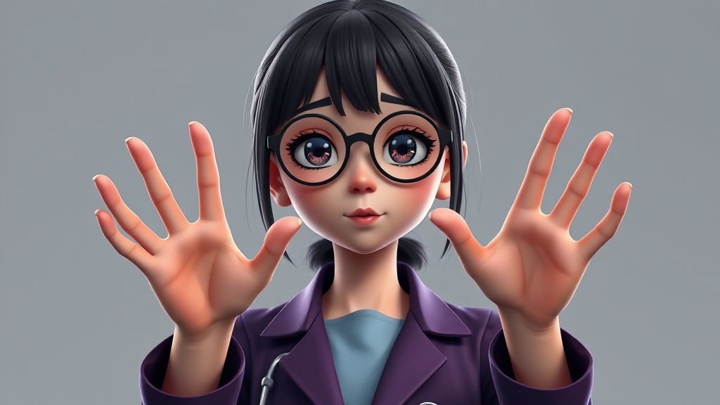A 3D render of an anime girl character with round glasses in a hyper-realistic style, wearing a dark purple lab coat inspired by Pixar, 3D, and Disney styles in 8k resolution. The artwork is beautifully framed like a canvas in a cartoon, 3D style with unusual color schemes. The character exhibits exaggerated features, such as additional fingers, and hands with unique shapes. There are elements of blurred and out-of-frame components, and the anatomy includes extra limbs and quirky proportions. The composition explores creative aspects of cloned facial expressions and perspectives, akin to video game aesthetics. The focus is on imaginative, unusual interpretations in the rendering, demonstrating intentional distortions and playful alterations in form.