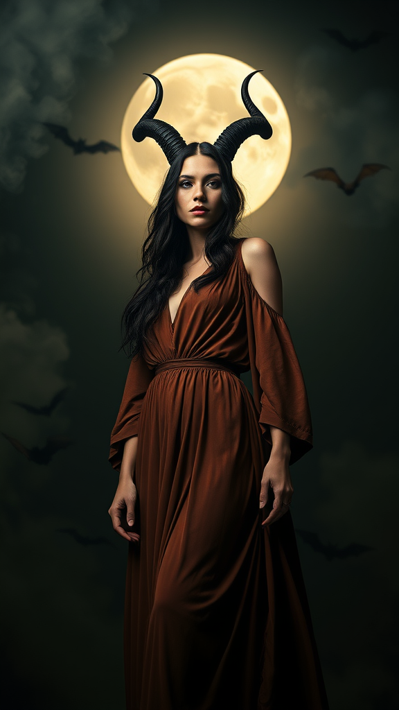 A woman with cascading, dark hair and elegant horns stands confidently in a flowing, earth-toned gown, set against a shadowy, mist-laden backdrop with bats fluttering around her. Her hair, a rich midnight hue, falls in gentle waves that frame her striking features. She wears a dress in a shade of deep mahogany, perfectly complementing her horns and adding to her enigmatic allure. The ambient background is enveloped in swirling, dark smoke, with bats darting sporadically, enhancing the mysterious atmosphere. Dim lighting accentuates the scene, illuminated by a luminous full moon that casts a mystical halo behind her. The perspective is dramatically low, emphasizing her commanding presence in the fantasy setting. The image exudes a sense of wonder through dramatic lighting and vivid hues, captured with a digital SLR or mirrorless camera using a wide-angle lens to encapsulate the sweeping, atmospheric background.