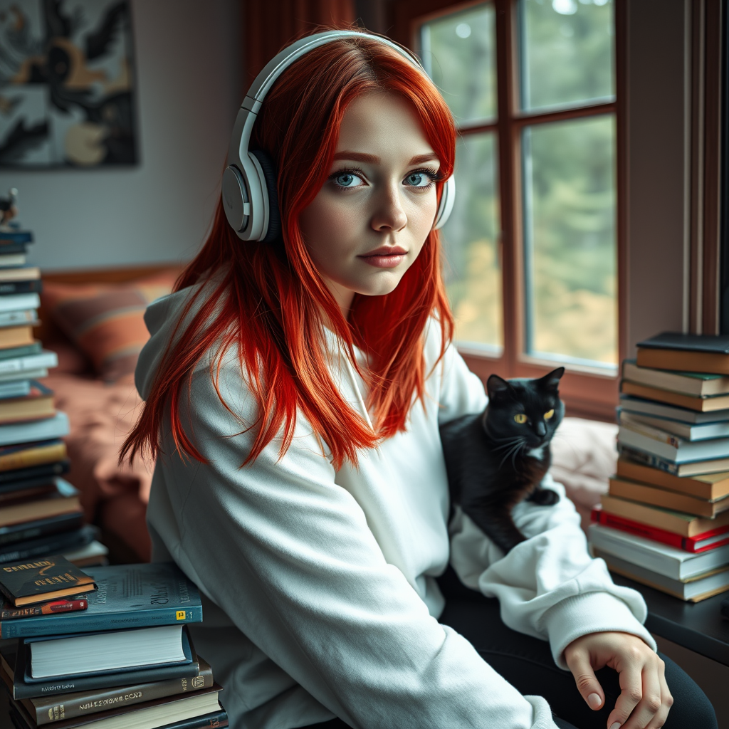 A stunning young Swiss girl is seated by the window, adorned with headphones and surrounded by a sea of books. She's dressed in a cozy white hoodie and sleek black jeans, her beauty highlighted by captivating neon eyes and vibrant red hair that falls to medium length. Her face features a smooth nose and delicate, thin lips. Glancing out the window, she occasionally shifts her gaze toward the camera, revealing an intimate connection. A black cat rests comfortably on her lap, adding a touch of warmth to the scene. Behind her, a bed is nestled amongst the stacked books, while the open window reveals a lush forest beyond. The atmosphere is captured in muted tones, with soft natural lighting creating a photorealistic effect. This professional portrait photography, shot with an 85 mm lens, embodies a sense of magic and dramatic lighting. The composition is intimately detailed, offering a sense of realism and an enchantingly mystical atmosphere.