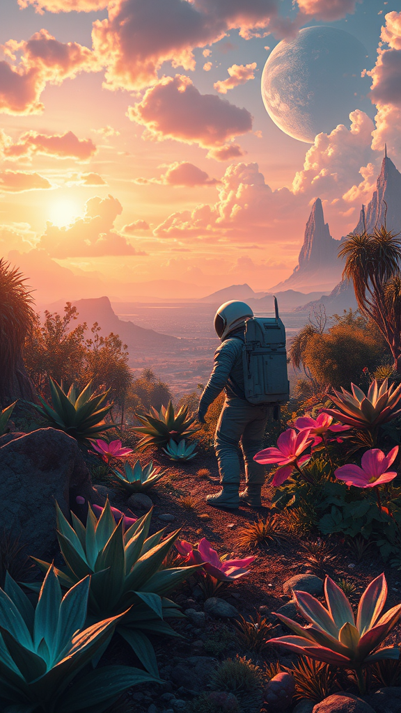 Illustration of an astronaut exploring a lush, alien landscape, surrounded by vibrant, otherworldly vegetation under a captivating sky, capturing the essence of a sci-fi masterpiece; highly detailed and immersive, showcasing intricate textures in sharp focus and rich colors, presented in 4k resolution with a sense of wonder and discovery, akin to artwork trending on ArtStation; subtle enhancements include luminous bioluminescent plants and an awe-inspiring vista in the background, maintaining the core concept of an atmospheric and verdant world.