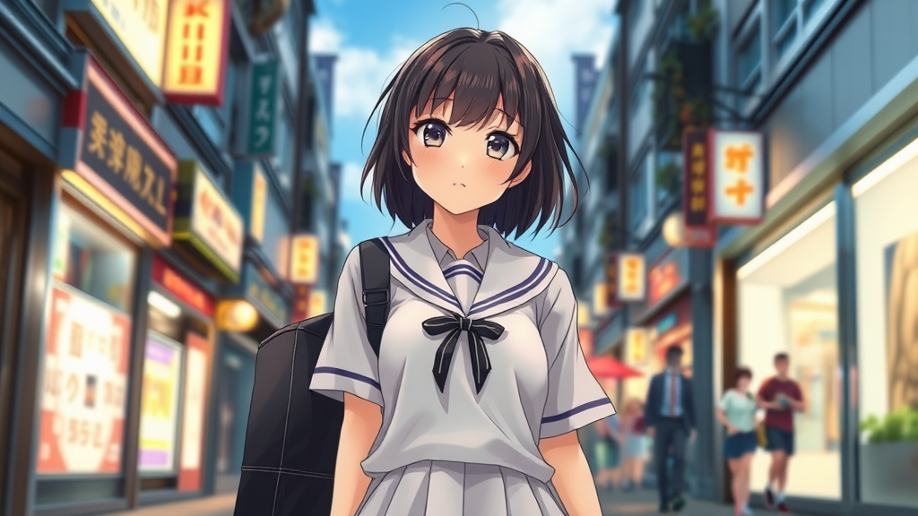 Charming anime girl strolling along a bustling street, clad in a pristine school uniform, captivating CG anime style, featuring a delightful young high school girl, rendered in a striking realistic 3D anime art style, illustrated by skilled anime artists, akin to visual novel concept art, depicting the innocence and charm of a young anime schoolgirl, painted with meticulous detail in an anime artist's studio, showcasing a lifelike and enchanting portrayal of a schoolgirl in a realistic anime aesthetic.