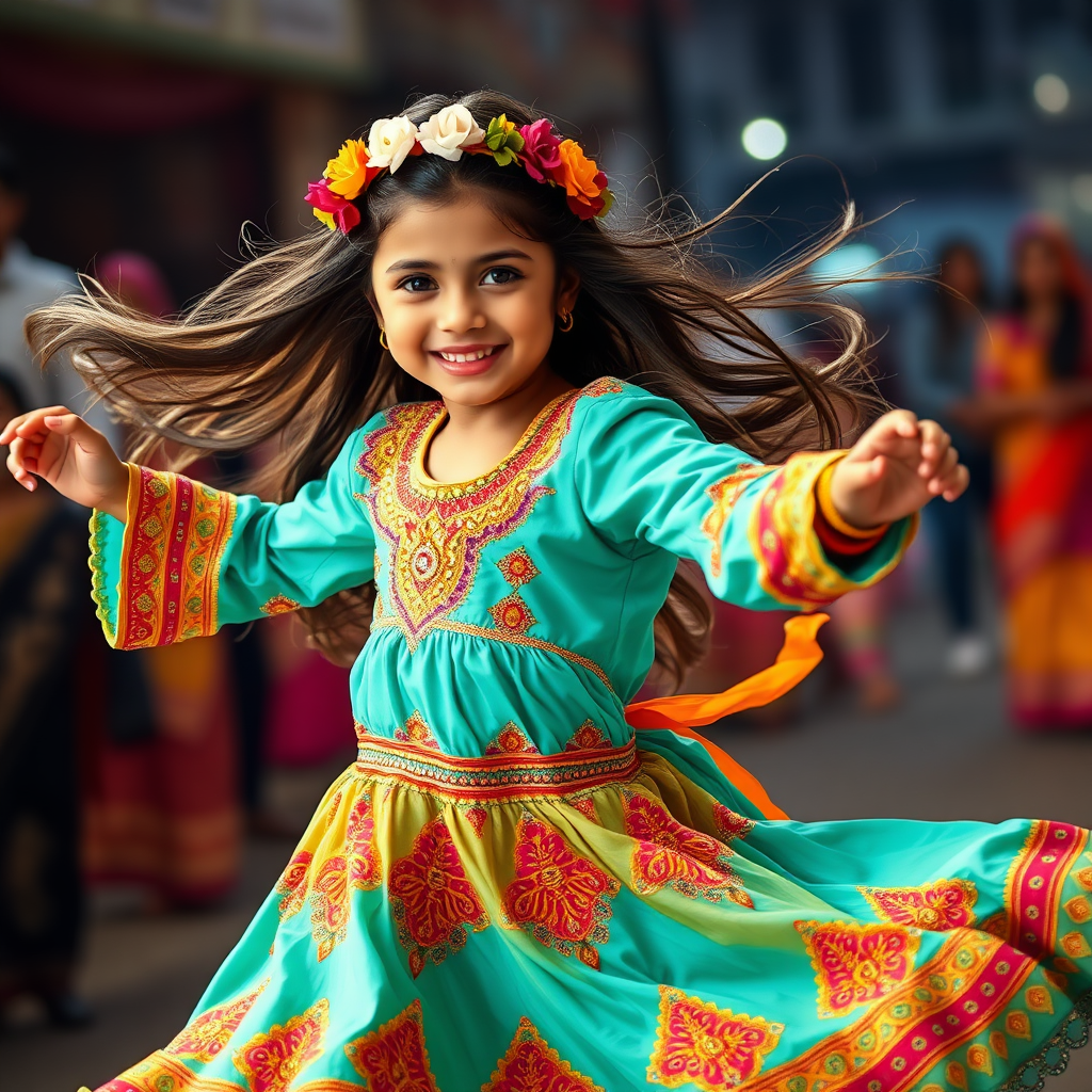 A young girl twirls joyfully in traditional attire, her vibrant presence radiating with grace. She wears a richly decorated dress in shades of turquoise and saffron, intricate beadwork creating patterns across the fabric, and a floral wreath adorning her head. Her long, flowing hair enhances the sense of dynamism, capturing the essence of movement. Her expression is one of pure delight, a bright smile illuminating her face and creating an aura of celebration and exuberance. The softly blurred backdrop, with hints of fellow revelers, keeps the focus solely on her, highlighting the juxtaposition of vivid colors and her lively dance. This image exudes a spirit of cultural festivity and youthful joy.