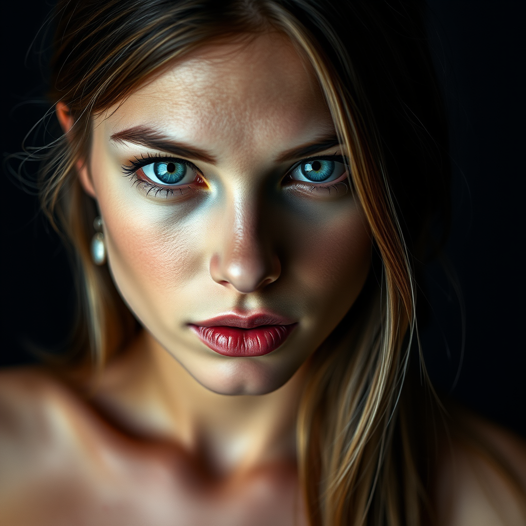 RAW exquisitely detailed studio full body portrait of a stunningly beautiful young woman with mesmerizing icy blue eyes, captured in dim lighting. A hyper-realistic, ultra-detailed photograph shot using a Leica SL2 with a 105mm lens at f/5.6, reminiscent of the iconic styles of Irving Penn and Annie Leibovitz, with the meticulous retouching expertise of Pratik Naik. Subtle artistic enhancements add a unique touch while maintaining the essence of the original vision.
