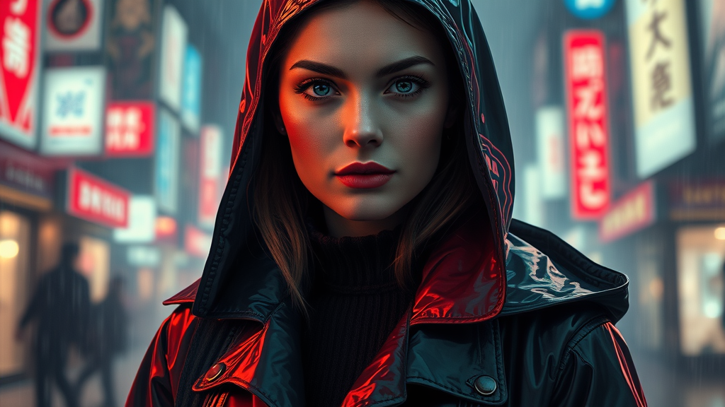 A highly detailed portrait of a young European woman wearing a stylish raincoat with a mix of futuristic sci-fi and regal fashion influences. Her outfit, reminiscent of a movie scene, features elements of cyberpunk with a neo-Tokyo and synthwave aesthetic, illuminated by low-emission neon lights similar to what you would find in a Blade Runner setting. The scene reflects the artistic styles of Ismail Inceoglu, Dragan Bibin, and Greg Rutkowski, capturing fine details with a perfect face, sharp chin, and realistic shading. The atmosphere combines the surreal touches of Rene Magritte with the modern flair of Alexandros Pyromallis and Nekro. Despite the stormy backdrop, her expression remains serene and captivating. Avoid any distortions such as low quality, jpeg artifacts, or disfigurements. Focus on maintaining a balanced anatomy with proper proportions and natural details, reflecting a fusion of artistic elegance and futuristic allure.