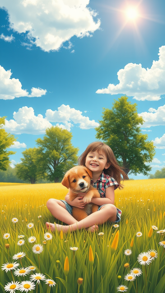 In a wide-open meadow under a bright blue sky dotted with fluffy clouds, a charming puppy snuggles contentedly in the lap of a cheerful young girl. She sits cross-legged among the dandelions and daisies, her laughter mingling with the gentle rustle of leaves from the towering green trees encircling them. The sun casts a golden glow over the scene, reminiscent of Charles M. Schulz's whimsical comic style, bringing warmth and happiness to the idyllic spring day.