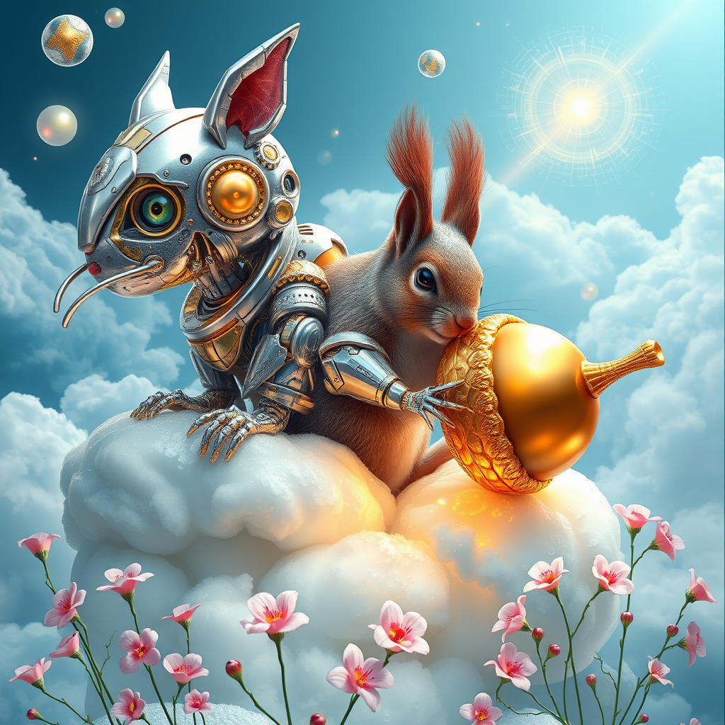 Cyber Bling masterpiece from the 'Art of Command' series by Jasper Harvey, featuring futuristic visuals, shimmering silver and gold, intricately detailed facial characteristics, spiraling vortexes, three-dimensional whimsical cyborgs composed of radiant crystals on a cerulean cloud. A chubby squirrel with rosy fur perched on the cloud, releasing a gigantic golden acorn from its paws, tumbling into a pristine clearing adorned with blush pink snowdrops—style unrefined, capturing the essence of dynamic innovation.