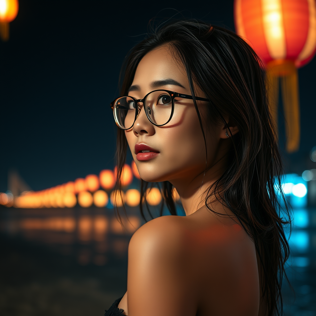 Three-quarter close-up portrait of a captivating 30-year-old Asian woman with an athletic figure and a stunning face, exhibiting a gentle and serene expression. She wears glasses and gazes thoughtfully into the distance, her hair slightly wet from the beach at night around 11pm. The scene is set against a dramatic, expressive background with cool glowing lanterns, and the lights of a nearby town twinkle in the distance. The cinematic shot is captured from a low angle using a DSLR with a wide-angle lens, aperture f/8, shutter speed 1/250 sec, and ISO 100. She's lit from behind to the side, creating dynamic and detailed natural reflections. The cinematic lighting gives off an anime-like quality with bright, almost blinding highlights. The image focuses solely on capturing her elegance, ensuring no distortions or imperfections, and preserving her natural beauty with clear, photorealistic clarity.
