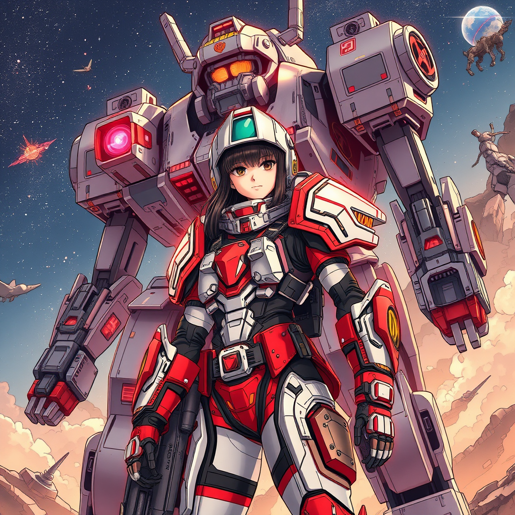 Epic full-length portrait of a warrior astronaut girl in intricate armor, posing with a towering battlemech. Captivating comic book style with elaborate detail, rendered in vibrant full-color manga aesthetics, blending anime key visual elements. Inspired by Valerian Nartfixer universe, showcasing the unique fusion of sci-fi and fantasy.
