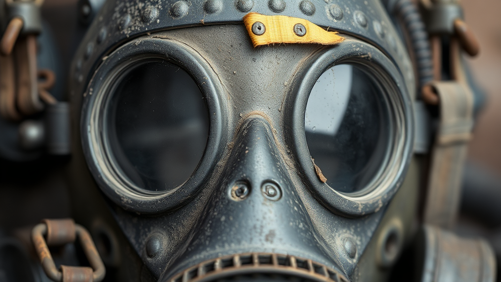 A detailed close-up of a Chernobyl liquidator's gas mask, capturing its authentic Soviet-era design with weathered, rounded lenses, thick rubber seals, and sturdy, worn straps. The mask is encrusted with layers of ash and dirt from the reactor's fallout, giving it a gritty texture. The metal clasps and buckles show signs of rust, hinting at years of exposure. A hint of faded yellow paint, once a mark of affiliation, can be seen peeling off the forehead area, adding to the mask's haunting history.