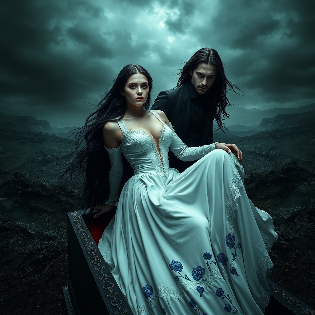 The scene unfolds against a wide, panoramic view of a dark, menacing landscape. At the center, a female vampire rises gracefully from a coffin, her eyes burning with an unsettling, otherworldly intensity. Her skin, a spectral shade of pale, hints at a supernatural essence. Her dark hair cascades down her back, streaked with glimmers that catch the sparse light. She is clad in a long, flowing white gown, adorned with a delicate pattern of blue flowers embroidered along the hem and sleeves. The dress bears hints of tatters, with threads shimmering subtly here and there. Her lips are a striking, rich red, slightly parted to reveal sharp, pointed incisors. A faint crimson glow highlights the corners of her mouth, accompanied by her eyes that shine with a fierce, insatiable hunger. Positioned behind her stands a male vampire, exuding the same intense allure. His skin is equally pale, whispering of his uncanny origins. His long, flowing hair, interspersed with shimmering highlights, complements his dark, enveloping cloak. The cloak, a deep red, features an intricate design along the edges and sleeves, and also bears signs of wear, with ephemeral threads catching the light intermittently. His lips mirror the deep red shade, parted just enough to display his menacing fangs. His mouth, too, is traced with that slight crimson glow, while his eyes hunger in tandem with the female's. To the left, dark, contorted trees stretch towards the turbulent sky, their branches clawing like skeletal fingers. The stormy sky serves as a backdrop, with clouds twisting and swirling ominously. On the right, the open coffin, crafted with intricate wooden carvings, reveals a mysterious gloomy interior lined with a luxurious, soft white material, possibly silk or satin. The entire atmosphere of this haunting image brims with eerie suspense, foreboding the unfolding of an eerie mystical event.