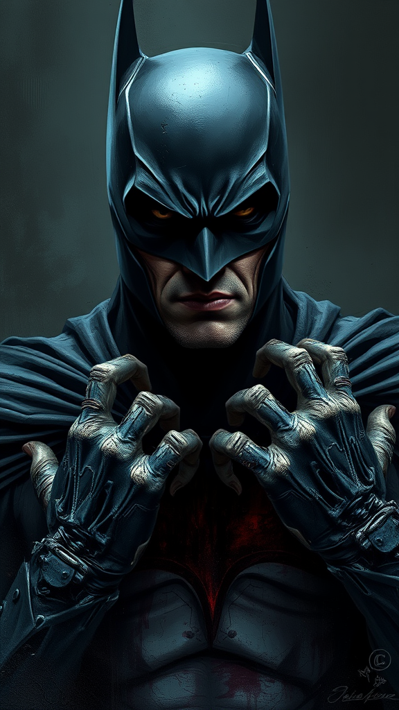 Digital wallpaper portrait of Batman, the Dark Knight, in the style of comics, 8k resolution, rugged aesthetic, inspired by Marvel comics, depicting a sense of desperation. The composition is epic and dramatic, set against a dark background using muted colors. The digital painting is emotionally profound and intricate, featuring textural elements. The depiction includes intentional imperfections such as low quality and jpeg artifacts, with a deliberately ugly and morbid appearance. The character is shown with rough and deformed features, including poorly drawn hands, a distorted face, and bad anatomy. Proportions are intentionally skewed, showcasing extra limbs, cloned and disfigured facial elements, and malformed features. The artwork intentionally explores themes of mutation and deformity, incorporating aspects like a long neck or disfigured body. The image contains elements like camera angles, blurred sections, and distorted framing, avoiding trademarks or recognizable symbols.