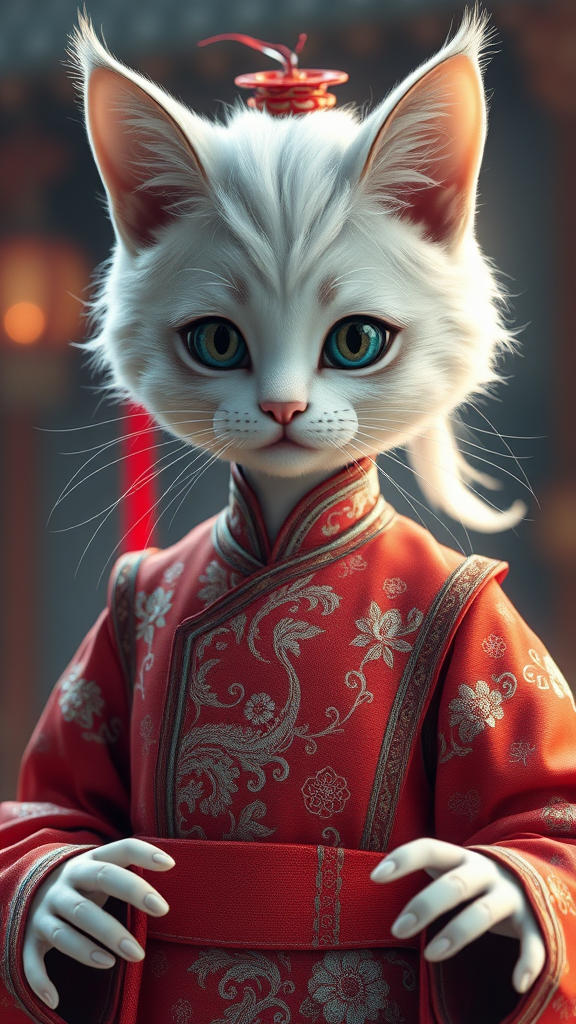 White hair, 12th century-inspired, adorable cat girl wearing an elegant traditional Chinese dress, exquisitely detailed face, captivating eyes, ultra-realistic 8k rendering, soft lens flare, atmospheric glow, intricately detailed, vivid color palette, cinematic lighting, artstation trending style, hyper-realistic focus, crisp details, produced in Unreal Engine 5, cinematic quality, artistic masterpiece, dynamic lumen reflections, photography-grade composition, breathtaking environment, hyperrealistic CGI, 3D artistry, porcelain doll-like features, Octane rendering, subtle distortions, slightly blurred edges, multiple arms and fingers, creatively altered anatomy, abstract textures, unique character design.