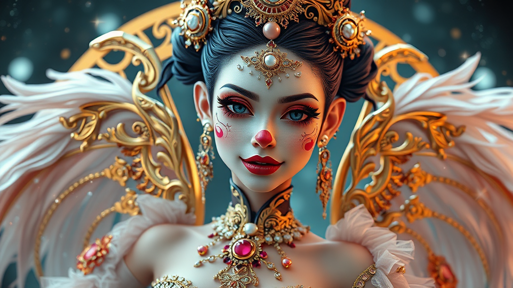 Pixar-inspired 8k portrait photo of a stunning and opulent galactic prima ballerina with a Russian clowncore aesthetic, embodying the essence of a cyborg college girl. Featuring elements of sci-fi, fantasy, and cyberpunk, the image is rich with intricate and decadent details, capturing the essence of the golden ratio. This digital painting is reminiscent of Ever After High style, rendered in octane for a highly polished finish. The artwork has a smooth, sharp focus and echoes the styles of Artgerm, Loish, and WLOP, with a touch of negative space for balance and a relaxed, dream-like quality.