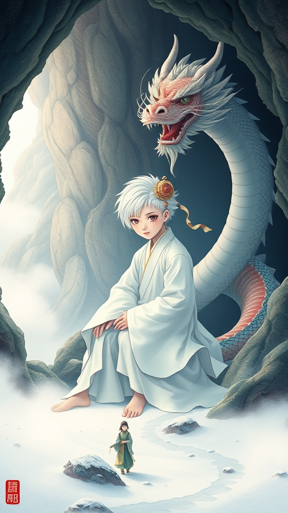 A celestial Chinese boy with striking white hair resides in a mystical cave, adorned in a flowing white Daofu robe and a delicately tied headband. Beside him coils a majestic Chinese dragon, its scales shimmering in a vibrant display, captured in the enchanting style of Japanese Ukiyo-e. The scene unfolds in a beautiful landscape reminiscent of a Chinese fairy tale, where mist swirls gently above the ground, blanketed in pristine white snow. Graceful figures move elegantly amid the ethereal surroundings, their presence enhancing the otherworldly tranquility of this serene tableau.