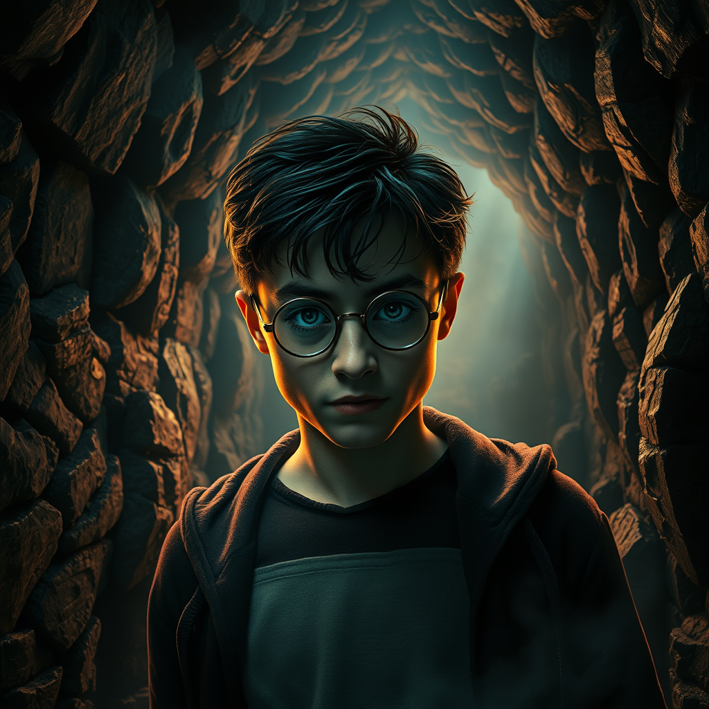 Harry Potter trapped in a dark, sinister dungeon, his iconic glasses reflecting dynamic, eerie light, casting ominous shadows across the stone walls. The atmosphere is a surreal blend of mystical and magical, with a sense of creeping dread filling the air. The setting is intricately detailed and photorealistic, as if the twisted visions of H. R. Giger, Jean Ansell, and Justin Gerard have come to life, featuring grotesque and intricate designs that blur the line between nightmare and reality. Harry stands amidst this haunting landscape, his expression a mix of fear and determination as he faces the unknown.