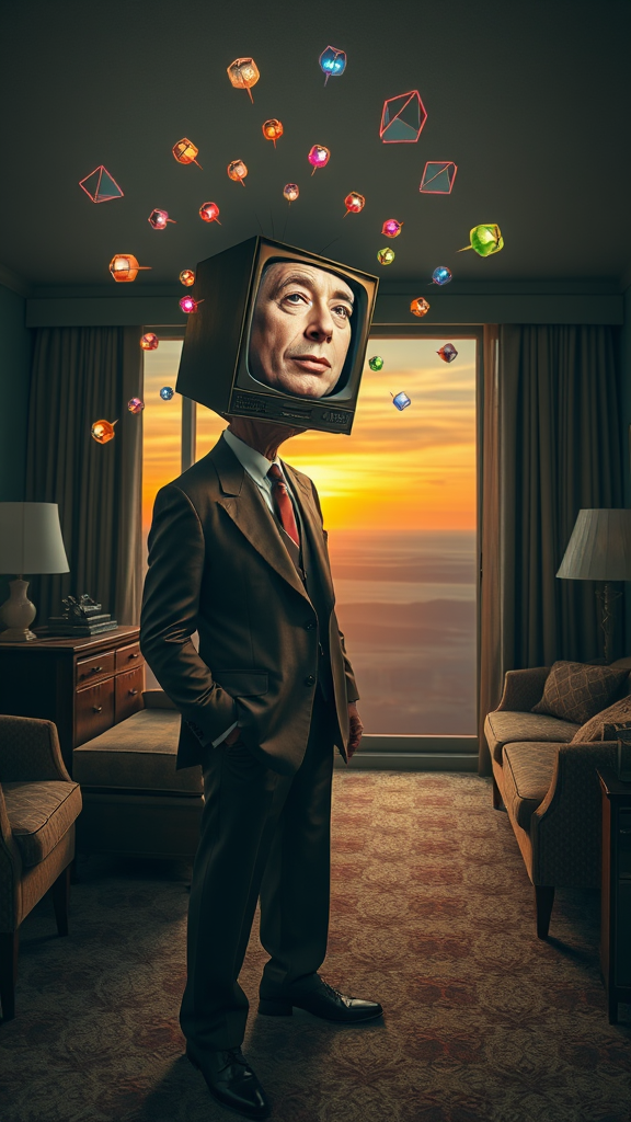 A dreamlike scene of a man dressed in a vintage suit standing in a living room with a plush, patterned carpet and retro furniture, his head replaced by an old television set. The screen displays a continuous loop of his head with exaggerated features, where his eyes slowly blink and his mouth occasionally opens as if speaking. Surrounding the man, floating in mid-air, are tiny glowing orbs that mirror his displayed facial expressions in vibrant colors. In the background, a window shows an endless sunset horizon, blending seamlessly with abstract geometric shapes in the sky.