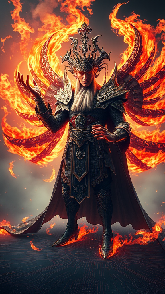 A formidable monarch, sovereign of flames, engulfed in a swirling blaze amidst a misty backdrop, exuding magnificence with a flawless visage. He stands firmly on ground reminiscent of a circuit board, adorned in detailed attire. Envisioned in a fantasy realm, this illustration is worthy of Artstation acclaim, crafted in a hyper-maximalist, overly intricate cinematic tribal dark fantasy style. Rendered in 8k resolution, the scene is of ultra-detailed quality using a 3D Octane Render, achieving a photorealistic concept art level. With sharp focus, impeccable composition, and dramatic shadows and lighting, this creation is suited for a stunning wallpaper in HDR, offering high-quality, high-definition visuals.