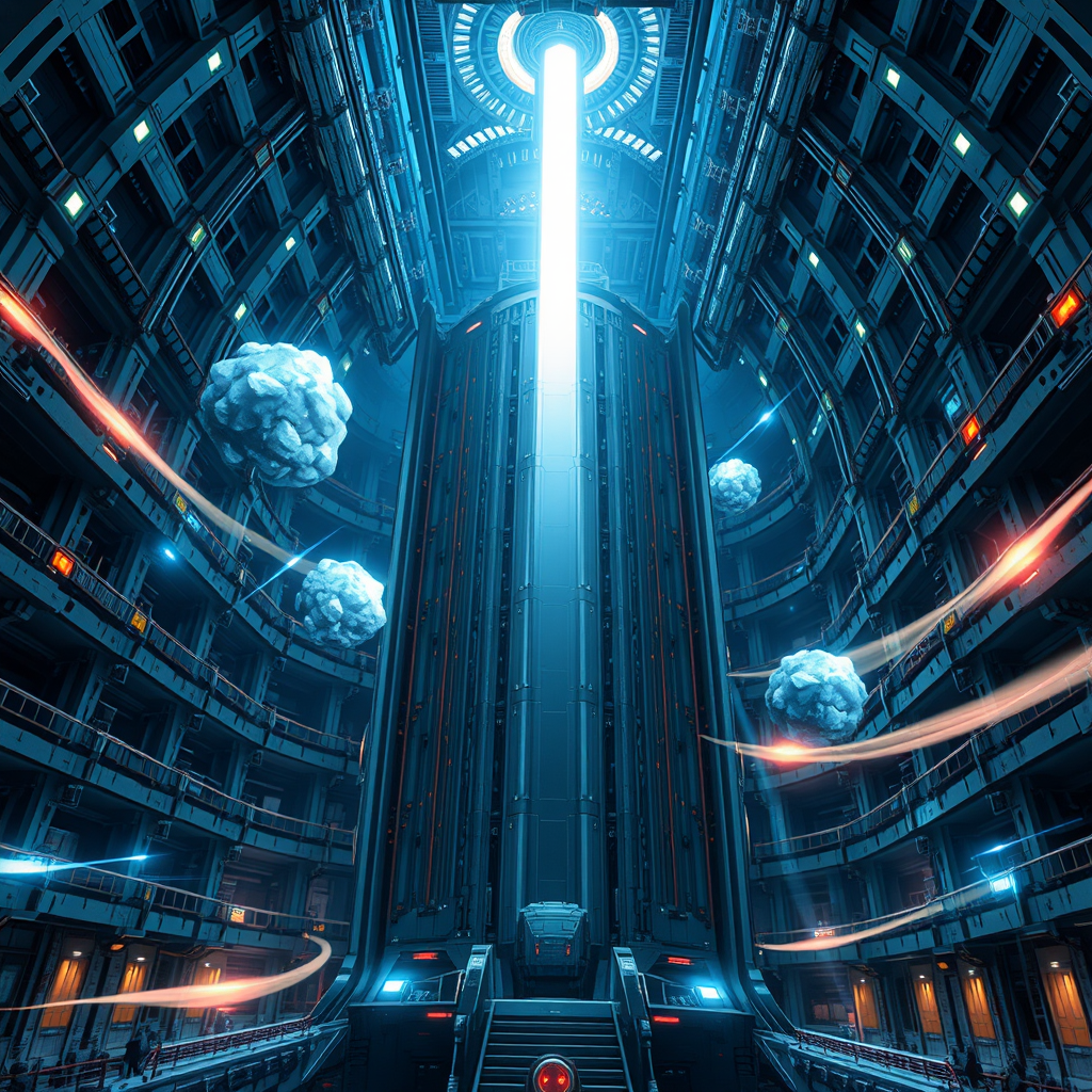 Inside an expansive spaceship, reminiscent of Tsutomu Nihei's style seen in Sidonia no Kishi, the space embodies a sense of gigantism. At the core, a colossal laser generator dominates, surrounded by a multi-story environment with a futuristic aesthetic. The sci-fi scene is intricately detailed, with a central laser beam piercing skyward, accompanied by energy clots that pulse and accelerate. Flashes of light signify the immense speed and energy coursing through the space. Capturing the essence of anime and manga graphics, the visual is crafted in 8K HD Super-Resolution, maintaining hyper-realistic detail and dynamic motion.