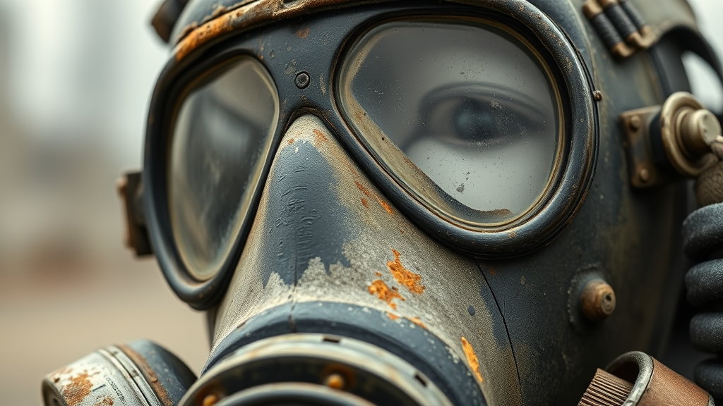 A close-up shot of a weathered Chernobyl liquidator's gas mask dominates the frame, showcasing intricate, gritty details. The mask, reminiscent of Soviet-era designs, features rounded, slightly fogged lenses, robust rubber seals, and sturdy, heavy-duty straps. It is layered with a mix of ash, grime, and subtle rust patches from exposure to the reactor's fallout, hinting at years of relentless service. Small cracks and scuffs on its surface tell a silent story of resilience and the harsh reality faced by its wearer. The background, a blurred haze, emphasizes the mask's prominence and haunting history.