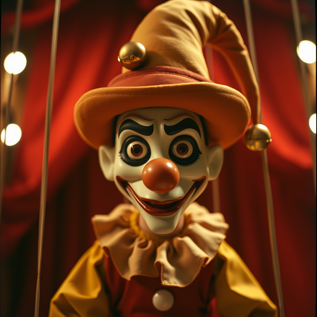 Cinematic still portrait, captured in the whimsical style of Tim Burton, featuring a Puppet Jester with mischievous eyes. The Puppet dons a classic Fool's outfit and a jingling cap 'n' bells hat. Positioned on a puppet theater stage, the portrait shot is infused with dramatic cinematic lighting. Using a 1970's Leica M3 rangefinder camera equipped with a Summicron 35mm lens, the image is captured with a wide aperture of f2, ISO 600, and a shutter speed of 1/50 on vintage 1970s Kodak color film. The eye-level close-up highlights the Puppet's intricate details and rich textures, set against a theatrical backdrop. --no bad anatomy, text, signature, watermark, username, low resolution, worst quality, low quality, jpeg artefacts, blurry, cropped, badly framed --ar 2:3 --v 4 --c 60 --s 600 --seed 191013 --s 50
