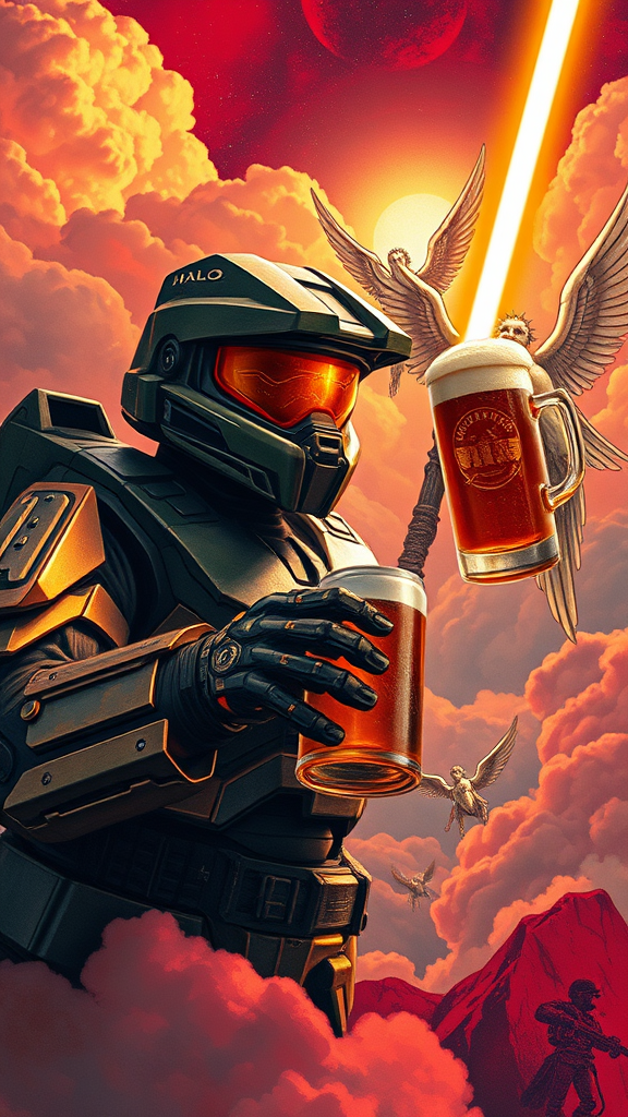 Master Chief from the game Halo brandishing a beer mug amidst a cosmic battle backdrop; stunning craftsmanship with a keen focus; elaborate digital painting featuring concept art, evolved into a matte masterwork. Envision a Jedi lightsaber analytical poster, skillful technical drawing woven into an infographic with engineering precision, accompanied by handwritten insights. Embellished with intricate post-soviet inspired illustrations, surreal and ethereal beings echoing biblical angels drift within sunny, dense clouds. Rendered in 4k, the scene bathes in cinematic HDR lighting, exhibiting ultra-detailed, vivid shadows. The scene pulses with a not-quite-realistic aura, contrasted against a crimson-tinged abstract background, while deft artistic techniques sidestep visual pitfalls like disfigured or extra fingers, ensuring harmony in the fantastical assembly.