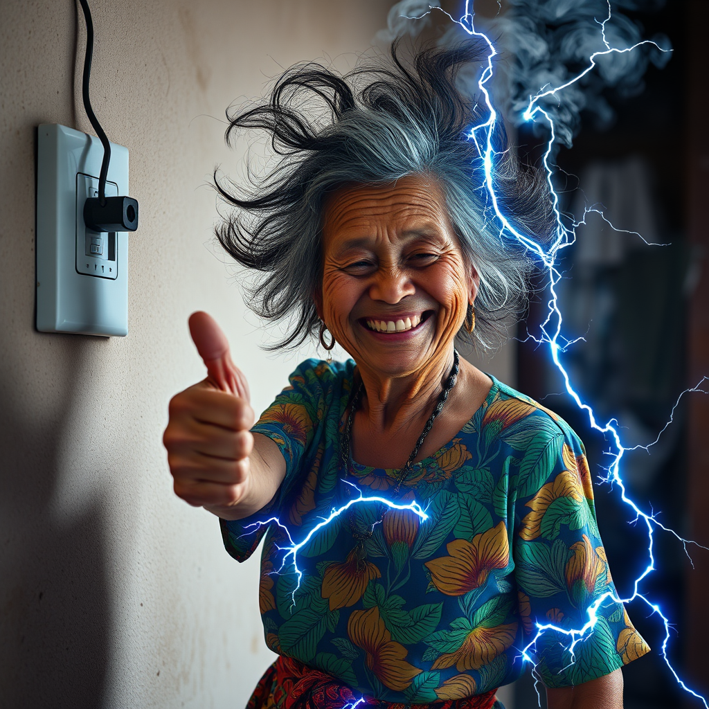 A spirited 70-year-old woman donned in a vibrant batik dress and sarong, reached for the electrical switch on her house's wall. Upon touching it, she was suddenly enveloped in a surge of electricity, causing her hair to stand wild and unruly. Wisps of smoke trailed from her head, while her face took on a charred hue, similar to blackened charcoal. Despite the circumstances, a broad grin stretched across her face, giving the camera a cheerful thumbs up. Electric blue sparks danced across her body, enhanced by dramatic lighting effects that captured the moment in stunning 8K high quality photography.