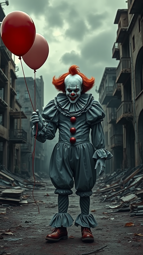 A sinister clown inspired by Pennywise holding a red balloon stands amidst a dystopian, post-apocalyptic landscape with crumbling and dilapidated buildings in the background, capturing a still from a horror film with photorealistic detail, eerie atmosphere, and haunting realism.