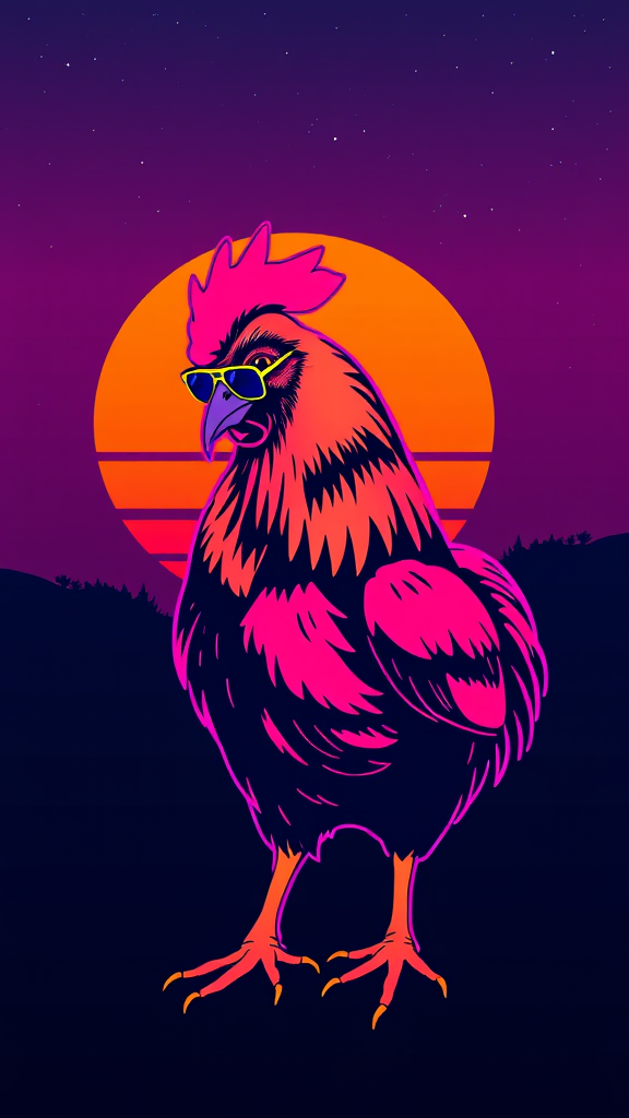 A vibrant 80s retro t-shirt design featuring a synth wave chicken wearing cool aviator sunglasses, standing confidently against a minimalist sunset. The sun has vivid oranges, pinks, and purples, casting a nostalgic glow. The chicken's silhouette is accentuated by neon outlines, and the backdrop is a subtle, star-speckled midnight blue, evoking a sense of synth-driven nostalgia.