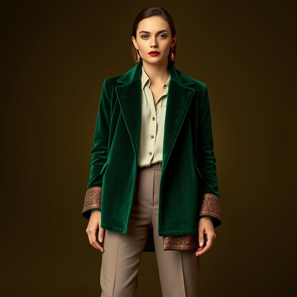 Fashion cover front view upper-body a woman model dark olive background a luxurious emerald green velvet coat adorned with intricate Persian carpet patterns around the cuffs and collar a delicate cream blouse and taupe trousers a touch of elegance with vintage gold earrings and a subtle hint of red lipstick
