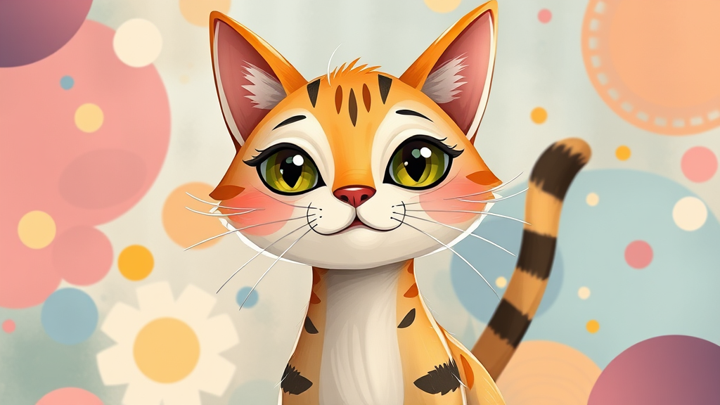 Cute cat illustration for storybook for kids inspired by the style of Tarsila do Amaral, featuring a whimsical and vibrant design with imaginative elements, UHD, HDR, 8K quality. The cat has playful crossed eyes, a quirky long neck, and charmingly unusual expressions that add character. It is set against a dreamy, colorful background with abstract shapes and patterns reminiscent of children's imaginative worlds. The composition is clear and vibrant, with every detail contributing to a captivating and enchanting visual experience, devoid of any technical imperfections or distractions.