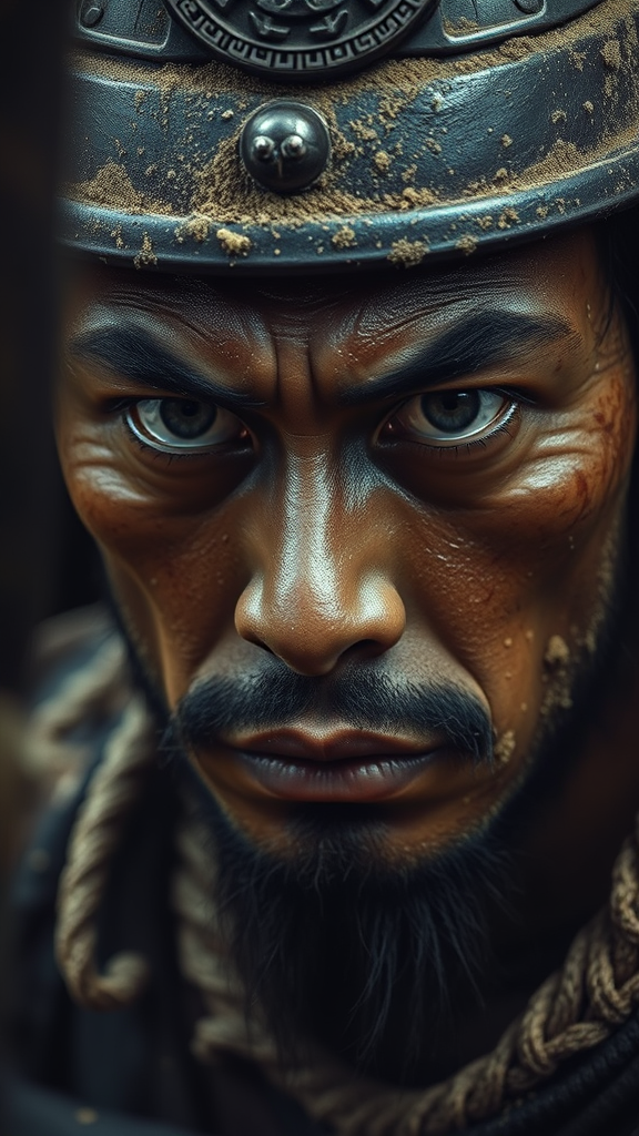 A lone samurai stares at the enemy, his eyes wide with fear and horror, exhausted and battered after the fierce battle. His face is smeared with sand and sweat, his expression a testament to the struggle he's endured. The atmosphere is steeped in darkness and dread, a haunting reminder of the conflict. In this hyper-realistic image, every detail is meticulously enhanced, with sharpness and contrast intensified to bring the scene to life. Subtle creative touches highlight the shadows cast across his face, adding depth to the narrative of his silent resilience amidst the chaos.