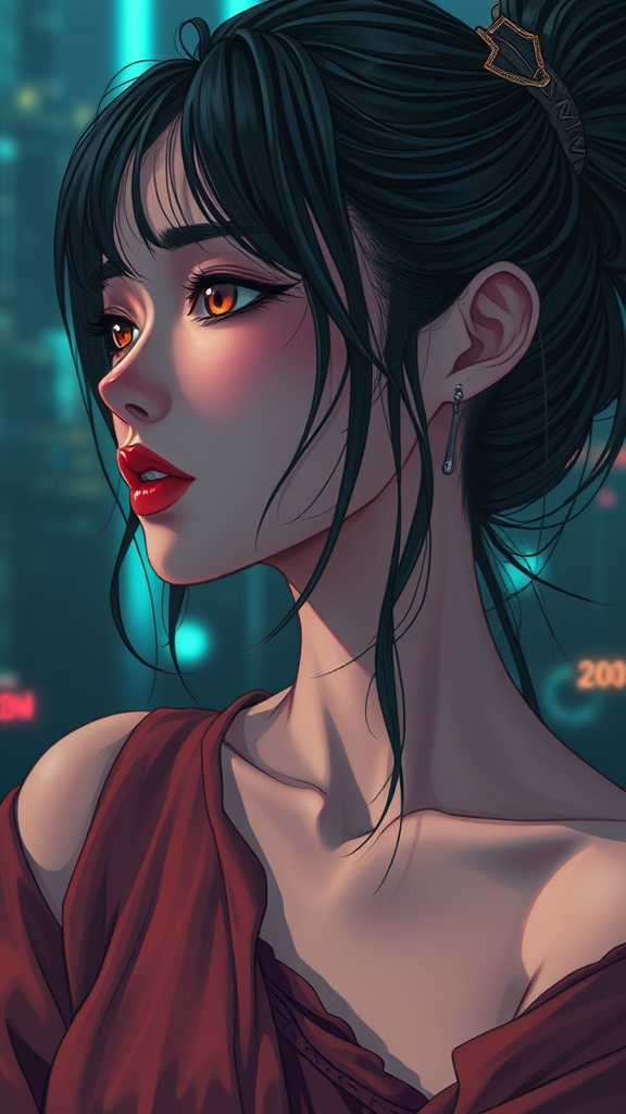 portrait of a woman in the style of an anime Ghibli film by Akihiko Yoshida, infused with cyberpunk and synthwave elements, set in a sci-fi universe. The image features soft lighting, with finely detailed and perfect features, embracing the elegance of low resolution. It captures a sense of mystery and allure, highlighting finely intricate details. The overall composition is well-balanced, avoiding common pitfalls like missing or extra digits, disfigured limbs, or awkward anatomy. The artwork maintains clarity without adapting into a confusing or low-quality presentation, ensuring no presence of jpeg artifacts, signatures, or watermarks. The portrait focuses on beauty, grace, and the innovative blend of traditional and futuristic design.