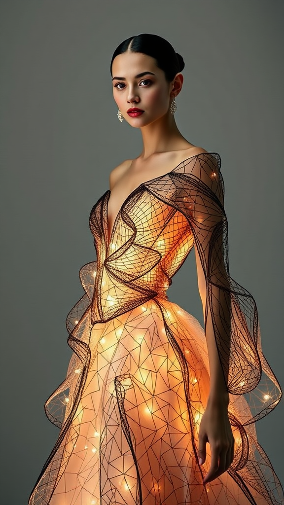 A model in an avant-garde haute couture gown with Iris Van Herpen-inspired sculptural design, featuring intricate light patterns, captured in a high-fashion Vogue editorial style; sharp focus with dynamic lighting, emphasizing the interplay of textures and movement, set against a minimalist backdrop; portrait orientation, 3:4 aspect ratio.