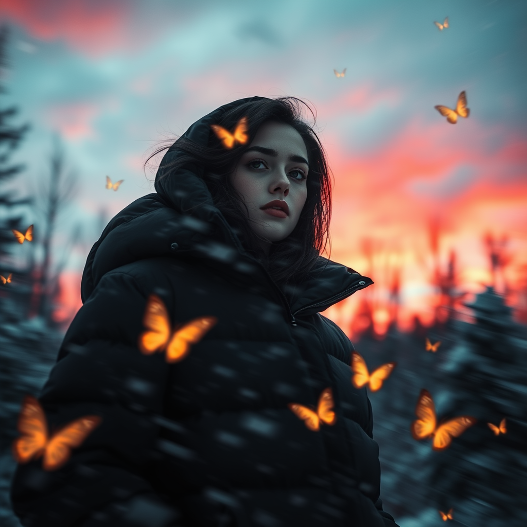Blurry image capturing a snowy winter puffer jacket fashion scene at night, surrounded by a surreal sky interwoven with dynamic winds and shifting hues of deep red and blue. In this dark forest setting, realistic butterflies softly glow, adding a touch of magic. The presentation maintains minimalist beauty with an androgynous appeal, featuring subtle shades of black in a cold palette. A cosmopolitan energy permeates the atmosphere, with serene faces reflecting calm amidst the loosening and fluidity of the scene. Ethereal abstractions weave through, hinting at chaos yet grounded in elegance and sophistication.