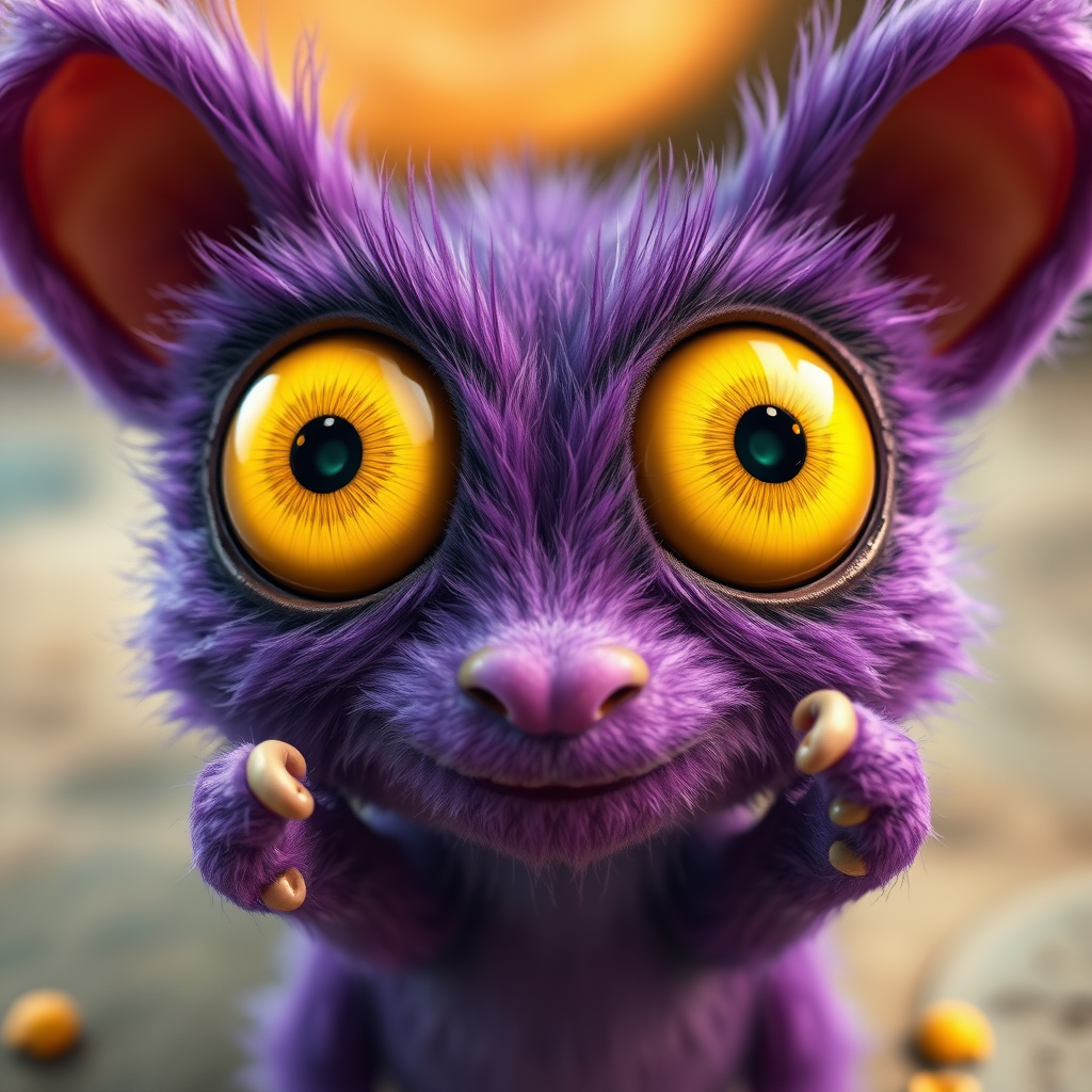 A charming, diminutive, purple, fuzzy creature with bright yellow eyes. Rendered in 3D with Unreal Engine, possessing realistic fur and a distinctive fish-eye effect. It has large reflective cartoon-like eyes reminiscent of a Pixar film, showcasing cinematic smoothness and intricate details. The creature features two heads with smiling faces, and the image is closely cropped, partially out of frame. Despite its cuteness, it has oddly twisted fingers and an extra-long neck. The composition includes overlapping and duplicated elements, giving an abstract feel, with some surreal and mutated aspects like disconnected limbs and mismatched proportions. The scene exhibits weird colors, intentional blurriness, and a touch of whimsical, playful deformities.