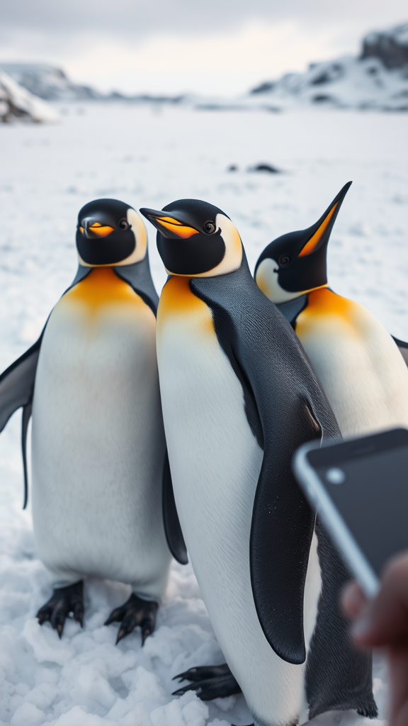 Three charming penguins in a snowy landscape posing for a selfie, rendered in the style of b-movie aesthetics with a hyperrealistic approach, capturing fine details as seen in bird studies, using photorealistic techniques. The scene is brought to life with hues of light yellow and dark silver, resembling captivating documentary photography inspired by the Quito school, with a playful twist and slight creative modifications to enhance the visual narrative.