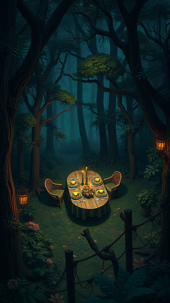 Intricate forest scene with atmospheric olive lighting, central table setting, 4k UHD clarity, conveying dark and mysterious vibes. Hyper-detailed with vibrant forest colors, an epic composition captured in sharp focus. High-resolution isometric view, blending semi-realistic CGI with sketch and cartoon elements, evoking both artistic charm and whimsy. Note: some areas feature intentionally abstract textures and playful imperfections for a unique artistic expression.