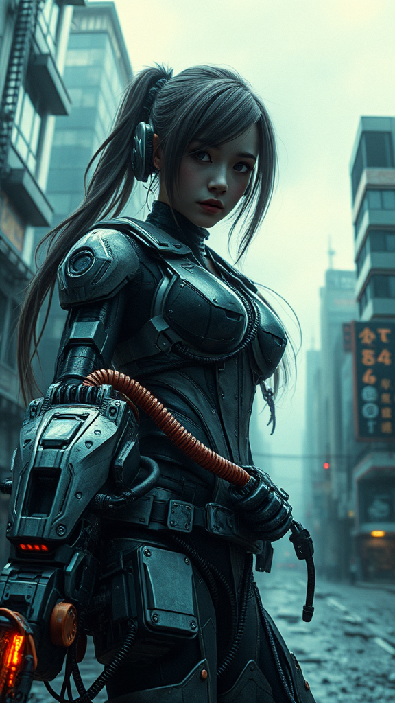 Sci-fi cyborg girl, dystopian urban landscape, hyper-realistic effects, dynamic wide-angle shot, blending human and machine elements, a gritty and immersive atmosphere reminiscent of a futuristic Neill Blomkamp film, cinematic cinemascope vision.