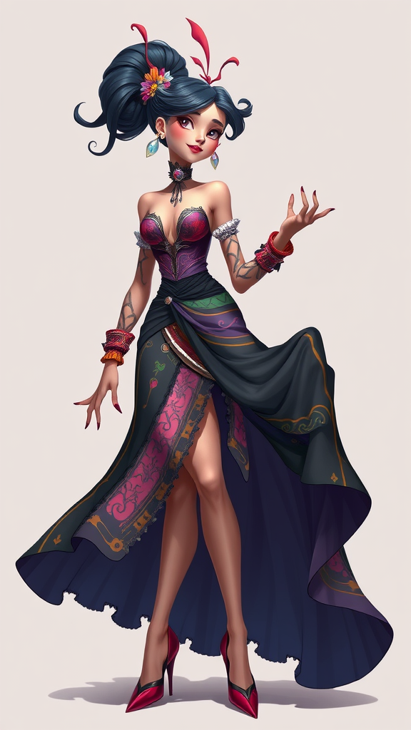 Highly detailed full-body illustration of an ardent woman in an alluring, avant-garde dress, engaging playfully; Character design with whimsy and charm, vibrant and expressive featuring intricate details, colorful stylization, and imaginative anatomy, crafted in high-quality digital art with 3D rendering elements; Uniquely stylized, reminiscent of award-winning art, blending Adobe Photoshop, 3D Studio Max, and V-Ray techniques; Exhibiting a playful and fantastical essence paired with a minimalist, simplistic background, slight deformations that add uniqueness without overwhelming.