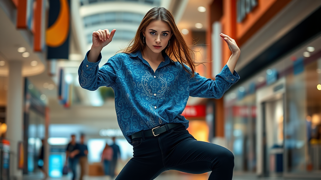 Full body shot portrait of a stunning model with striking blue eyes, gracefully dancing in a vibrant blue batik casual shirt paired with sleek black jeans, fashion-forward shot, editorial style, intricately detailed, artistic masterpiece with dynamic high contrast, set against the bustling backdrop of a modern indoor shopping mall.