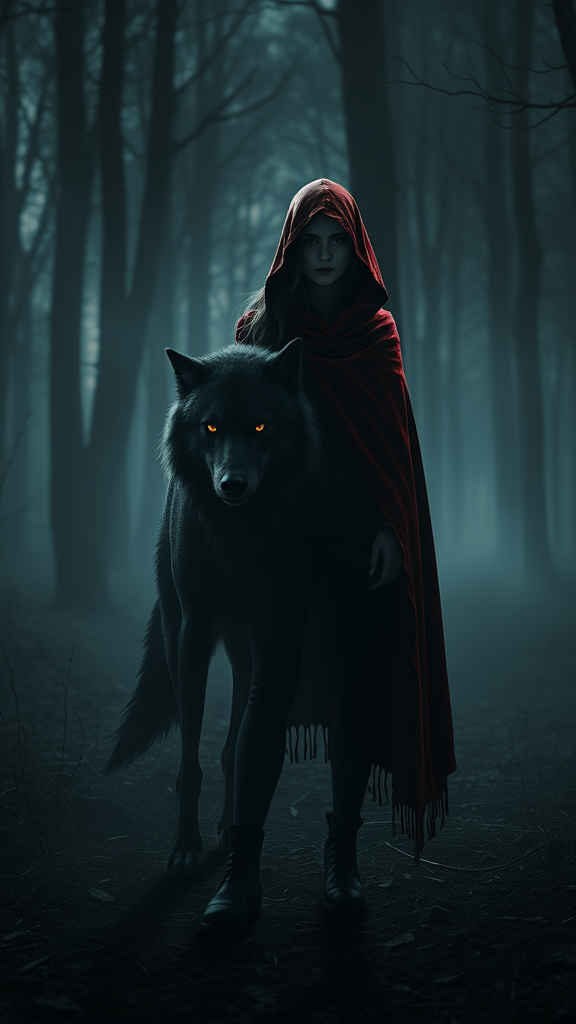 A young woman in a crimson hooded cloak stands confidently beside a tamed, ominous wolf with glowing eyes, their figures silhouetted against a dark, misty forest. The scene exudes an eerie, macabre allure, capturing a haunting atmosphere with hyperrealism. Shadows dance across the forest floor, detailed bark textures and fog lingering, creating a vivid, photorealistic environment in 8k resolution. The image reflects a blend of surreal and expressive artistry, crafted with precision using the Unreal Engine, bringing the 3d render to life with both beauty and dread.
