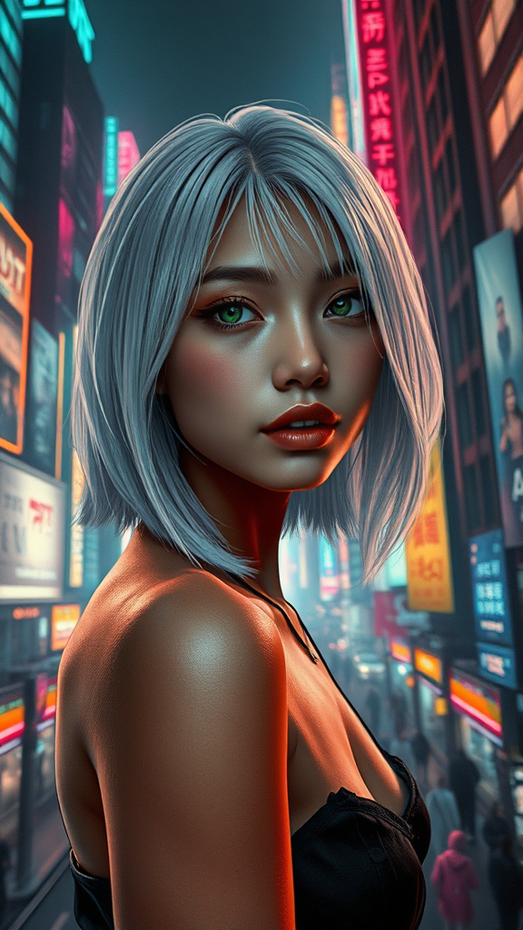 A cyberpunk landscape with ultra-realistic details and cinematic lighting showcases a stunning and detailed scene. A beautiful Asian girl with captivating features stands out with her olive skin and medium-length silver-white hair that gleams under the neon-lit city. Her face is exquisitely detailed, reflecting the vibrant and dynamic environment around her. The urban setting pulses with life, featuring towering skyscrapers, flickering holograms, and bustling streets, all enhanced by the interplay of shadow and light, creating an atmospheric and immersive experience.