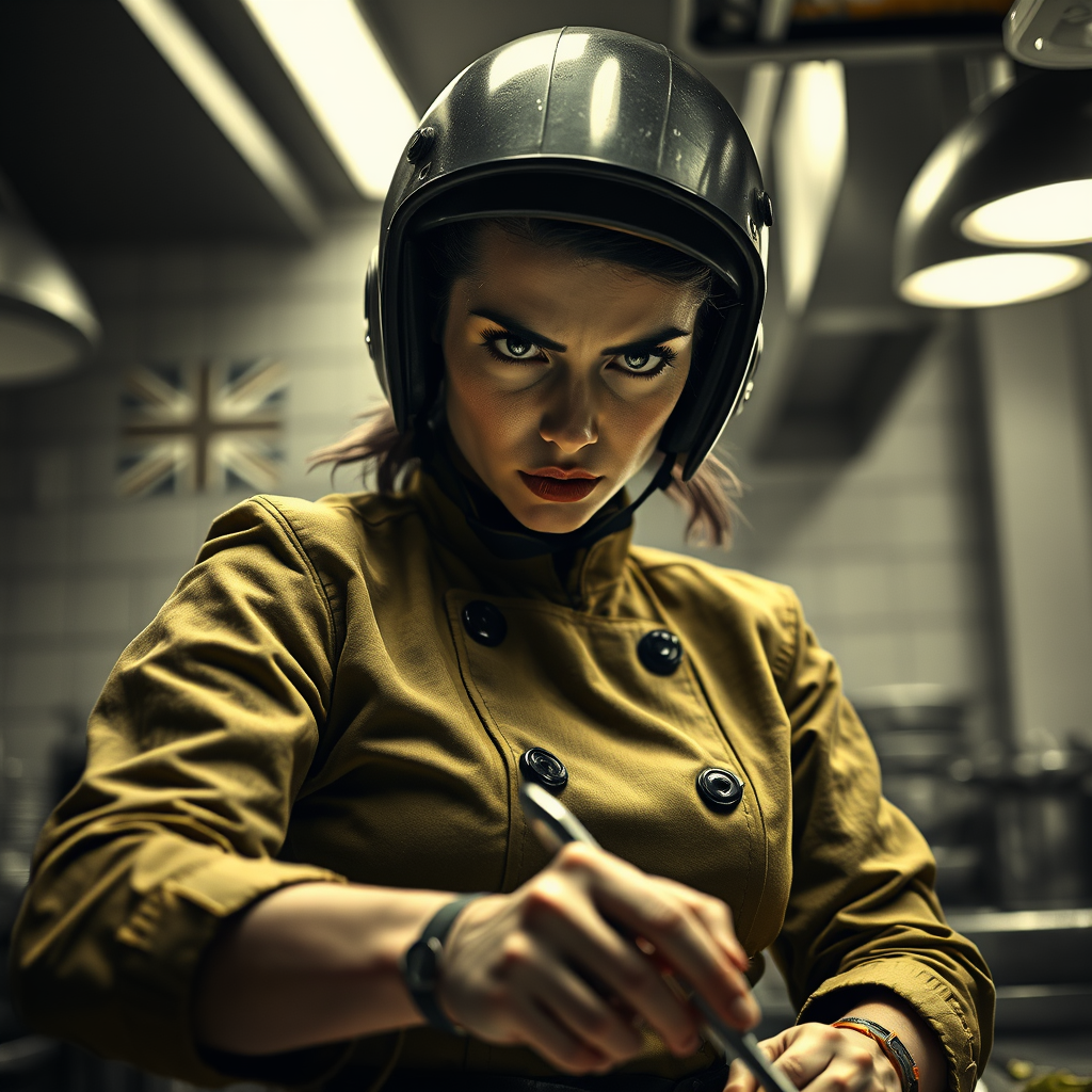In a Dieselpunk-inspired restaurant kitchen, an aggressive female chef stands poised with intense focus. Her intricate Chartreuse Earthy green uniform reflects sci-fi influences, detailed with futuristic designs and folds that showcase realistic fabric textures. The cinematic lighting creates dramatic shadows, enhancing her dynamic action posture from a low angle perspective. Her eyes are wide open, eyebrows raised in an expression of controlled anger as she prepares uninspiring food. Despite the simplicity and low contrast of the monochrome background, it subtly features faint stars and stripes and a hint of the union jack, adding an industrial sense. She wears a hard-surfaced helmet, emphasizing her no-nonsense demeanor. The scene, rendered in 8k resolution, captures every facial detail with mastery, depicting the frenzy of the moment in a subdued palette. The background noise of a bustling kitchen serves as a backdrop to this intense vignette, where artistry meets grit in the heart of culinary warfare.