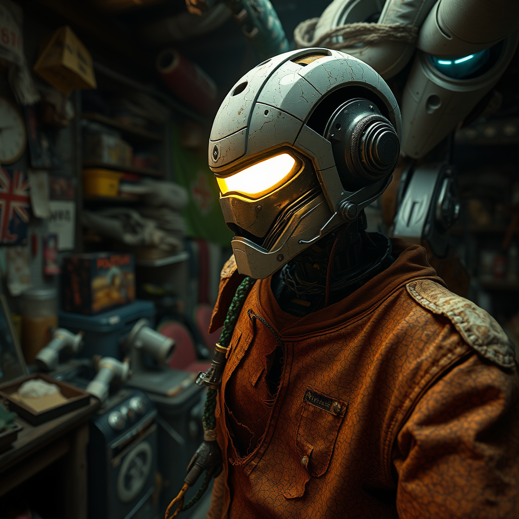 Wide angle environmental scene in a cluttered and chaotic shack, capturing an action shot, tattered and torn shirt, porcelain-like cracked skin resembling a League of Legends character, vibrant, photo-realistic and dramatic setting, dark atmosphere, sharp focus, rendered in 8k. A robot shattered into pieces with a glowing yellow visor portrayed as a realistic sci-fi cyberpunk knight, medium shot, intricate detailing, utilizing Unreal Engine, cozy indoor lighting akin to artstation's best, inspired by James Gurney, Katsuhiro Otomo, and James Paick. Features cinematic lighting with vibrant natural elements, influenced by artists like Craig Mullins, Greg Rutkowski, Pete Morbacher, and Tuomas Korpi, reminiscent of Tekkon Kinkreet, with volumetric light effects and trending on artstation. Executed with octane rendering, maintaining sharp focus and studio photo quality, displaying intricate and highly detailed artistry by Greg Rutkowski, presenting a blend of creative innovation while respecting the core essence of the concept.