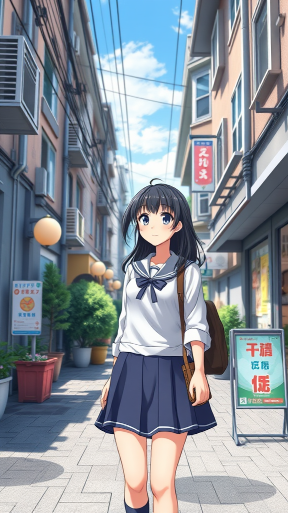 A charming anime girl strolls down a bustling street, dressed in a classic school uniform. The scene captures the aesthetic of smooth anime CG art, focusing on her enchanting appearance as a beautiful high school student. With lifelike three-dimensional elements blending seamlessly with traditional anime style, the visual exudes the feel of a visual novel's key art. Set against a backdrop typical of a townhouse neighborhood, this portrait presents a youthful anime girl brought to life with painterly detail in a studio setting, embodying the realism and elegance of contemporary anime art.
